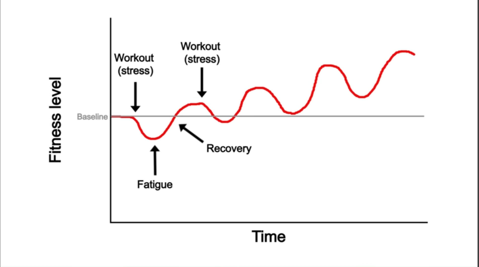 Wenn du jeden Tag Liegestütze machst, setzt du deinen Körper – insbesondere deine Muskeln, Gelenke und das zentrale Nervensystem – unter konstanten Stress. Das mag zunächst nach einem guten Plan klingen, um schneller stärker zu werden, aber der Körper funktioniert nicht so einfach. Schauen wir uns dazu das Diagramm an, das den Zusammenhang zwischen Training, Stress und Regeneration zeigt: